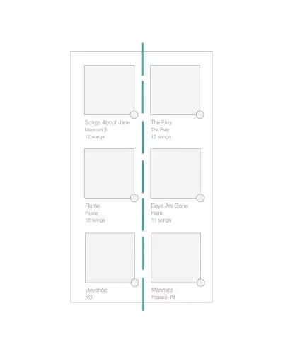 軸最常見于對稱元素的使用,當元素被布置成軸對稱的布局的時候,會給人有序感。就像生活中絕大多數的事情一樣,我們更傾向于享受有序的的東西,它們令人感覺平穩、舒適、平易近人。最簡單的一個例子就是iTunes 程序中的專輯列表的設計,所有的專輯列表在界面的左側保持對齊,圍繞虛線軸軸對稱。