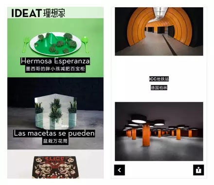 IDEAT理想家App,繼承了法國IDEAT雜志的理念,以展示設計、藝術和風尚的「當代生活」內容為主。App界面上除了內容圖片之外,幾乎沒有黑白以外的其他色彩元素。通過襯以黑底的高亮白字,既是內容又是裝飾,貫穿在整個App設計元素當中;調節這些文字與其他內容之間的間距,又在排版上起到作為點,作為線,甚至作為面的不同功用。