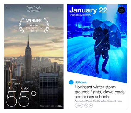 例如以設計精美著稱的Yahoo的兩款明星App產品Yahoo Weather!和Yahoo Digest。除了在產品設計上的和突出表現外,模糊和斜切的手法,給整個產品的品牌氣質提升到了一個新的高度。 Yahoo Weather! 不論是在布局、字體和色彩的運用上都顯得精致細膩,滑動時高斯模糊的處理更是流暢平滑。Yahoo Digest 的斜切突出一個“破”,在不影響照片內容的前提下,既能在視覺上顯得與眾不同,又在排版上巧妙地為色彩標簽留了一角之地。比起一刀平,更顯靈動而不失平衡感。