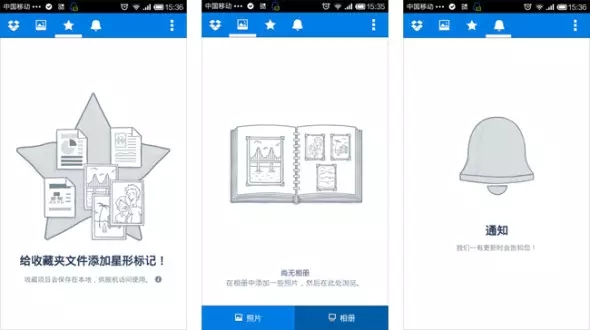 Dropbox是筆者非常喜歡的一款網(wǎng)絡(luò)文件同步工具,產(chǎn)品面臨的問題是需要引導(dǎo)用戶上傳內(nèi)容。應(yīng)用在用戶首次使用收藏、相冊(cè)及提醒功能時(shí)通過灰階加線條風(fēng)格的圖示和淺白的文字說明告知用戶如何使用這三個(gè)功能,畫面在保持一貫品牌風(fēng)格的同時(shí)也降低了用戶因?yàn)榱斜韮?nèi)空無一物而產(chǎn)生情緒上的挫敗感。