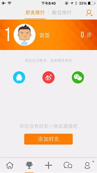 “樂動(dòng)力”的好友排行頁(yè)面,在沒有添加過好友的情況下,該頁(yè)面展示了一些社交網(wǎng)絡(luò)的圖標(biāo)和大大的添加按鈕提示用戶可以通過綁定社交賬號(hào)來找到更多好友一起PK運(yùn)動(dòng)量。