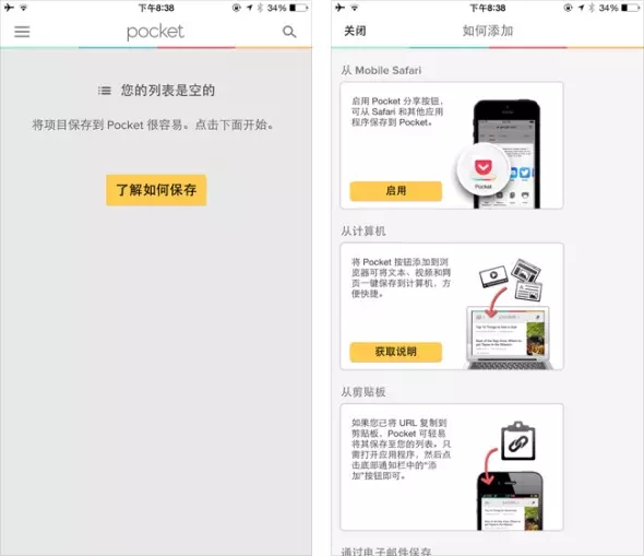 Pocket是一個(gè)可以讓用戶把內(nèi)容(文字、圖片甚至視頻)一鍵保存下來,用于其他時(shí)間完成閱讀的工具。在初次使用時(shí)它的列表頁(yè)面內(nèi)沒有內(nèi)容時(shí),會(huì)顯示一個(gè)“了解如何保存”的按鈕,點(diǎn)擊可以詳細(xì)了解添加列表的各種方法。