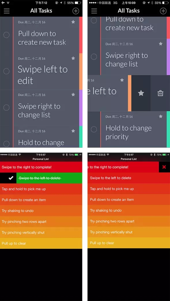Taasky和Clear作為兩款交互優(yōu)秀的任務(wù)應(yīng)用,都擁有非常豐富手勢(shì)操作,它們沒有像別的軟件一樣在界面上加遮罩、標(biāo)注做出冗長(zhǎng)的用戶教育頁(yè),而是直接將操作指引嵌在一條條的任務(wù)里,用戶只要跟著當(dāng)前任務(wù)的簡(jiǎn)單描述滑動(dòng)屏幕就能了解全部手勢(shì)操作,即充實(shí)了原本空白的缺省頁(yè)面又很自然地指導(dǎo)用戶如何使用該軟件。