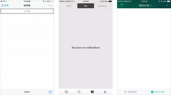 缺省頁(yè)面,是出現(xiàn)在用戶沒有提交任何資料或者網(wǎng)絡(luò)連接不通暢的情況下所展現(xiàn)的頁(yè)面。通常設(shè)計(jì)師們習(xí)慣用豐富的數(shù)據(jù)內(nèi)容把頁(yè)面設(shè)計(jì)得美觀實(shí)用,考慮的都是界面展現(xiàn)的“理想狀態(tài)”,往往會(huì)忽視沒有內(nèi)容的“缺省狀態(tài)”。未經(jīng)過精心設(shè)計(jì)的缺省頁(yè)面降低了用戶的使用體驗(yàn),并可能給用戶帶來困擾,如下圖iOS系統(tǒng)郵件App,無郵件時(shí)界面上沒有任何有效反饋信息,用戶不能明確得知到底是網(wǎng)絡(luò)問題還是賬號(hào)同步出錯(cuò)亦或者是收件箱內(nèi)確實(shí)一封郵件都沒有。同樣的情況也出現(xiàn)在Pinterest和出發(fā)吧的界面里。