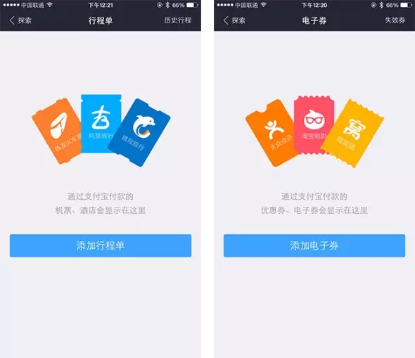 支付寶錢包的電子券和行程單頁(yè)面通過票據(jù)圖形+文字清楚地說明該分類下會(huì)出現(xiàn)什么內(nèi)容,并在屏幕下方提供添加票據(jù)的按鈕。