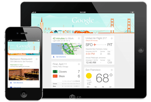 我們都知道你的app和網站在不同的設備下保持適配是一件很重要的工作。而卡片式設計就能很好的幫助我們來完成這一點。卡片式設計從根本上來說就是將頁面內容進行分解,然而再整合一個無法再進行分解的元素。而響應式設計要求的就是我們可以根據屏幕尺寸的大小對頁面內容就行調整。卡片式設計就可以對頁面內容進行分割重組來適應不同的屏幕。比如這個Google在手機設備上顯示一個卡片,pad端顯示兩個卡片。