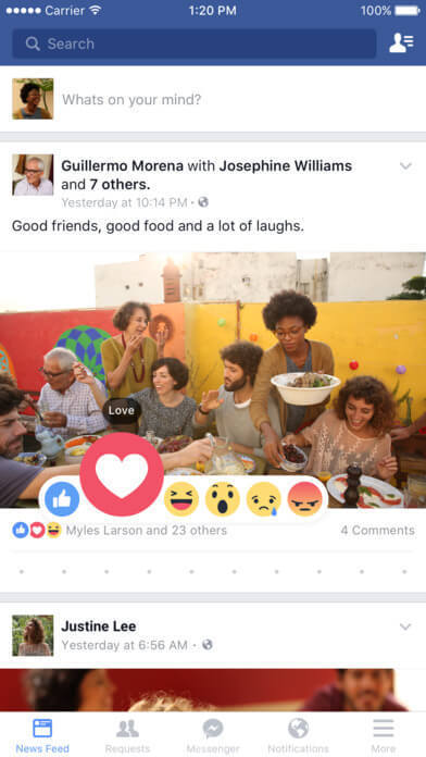 Facebook中好友的每條動態都是以一張卡片的形式展現的。用戶可以很快的完成對頁面信息的讀取。你可以不斷的往下滑查看更多的好友動態。你也可以看到多少人點贊,多少人評論與分享。這些功能誘導用戶積極參與互動,增加傳播性。
