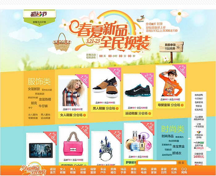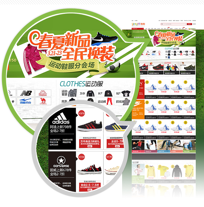 拍拍3月的大型促銷活動《春夏新品,全民換裝》,主會場設(shè)計上運用明快、鮮艷的春夏色彩塊組合,在細節(jié)上采用花朵草地藍天更加突顯初春購物的輕松氛圍。并在活動頭部主畫面中采用HTML5+CSS3實現(xiàn)的酷炫動畫,為用戶帶來了全新的頁面體驗。