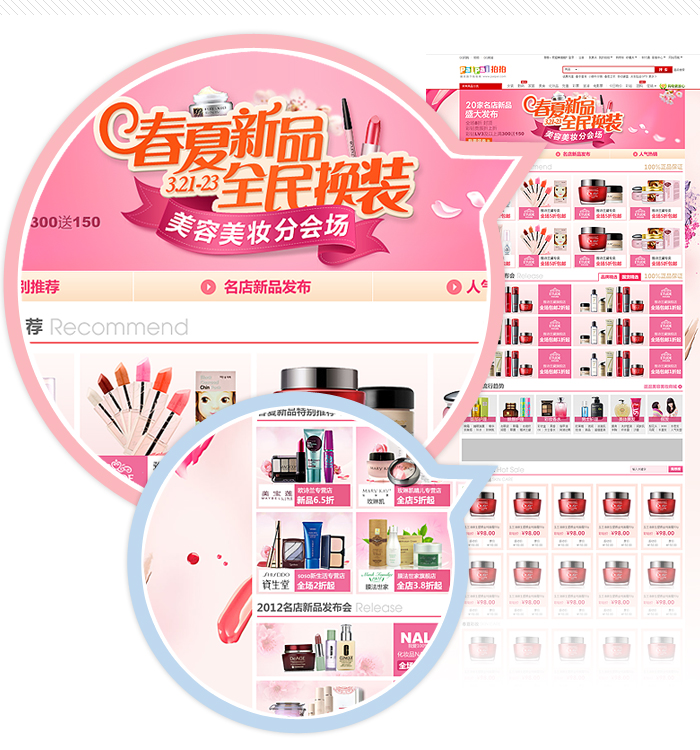 3月促化妝品分會場運用粉紅色為主色調(diào),更容易讓人聯(lián)想到粉嫩的肌膚和絢麗的彩妝。大背景使用護膚品和彩妝用品的特寫展現(xiàn)美容用品的美感,烘托賣場氛圍。