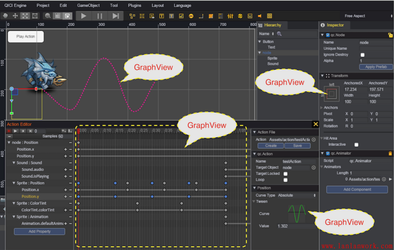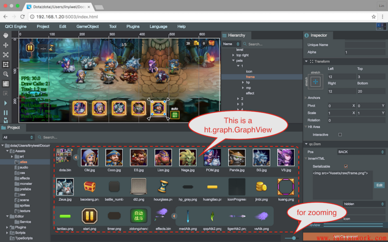 整個 QICI Engine 的 HTML5 游戲引擎編輯工具就是基于 HT 組件定制開發(fā)出來的,上圖刀塔場景的資源管理器就是圖標可縮放,圖集可展開合并,可縮小變成樹層次的 GraphView 拓撲圖,而第二張的動作編輯器、曲線編輯器等等部分也都是 GraphView 的身影。