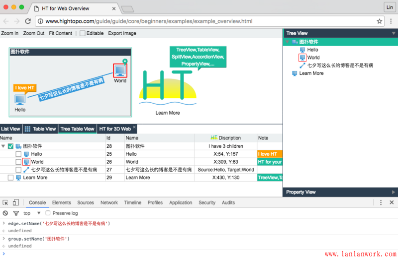 這個例子增加了設置父子關系的代碼,同時有更多的組件(拓撲圖、屬性頁、列表、樹、表格、樹表組件)綁定了同一個數據模型 DataModel,但用戶的代碼依然主要在 Data 和 DataModel 上的操作,這也是 HT 架構設計的優(yōu)勢,用戶使用更多組件并沒有增加新的學習成本,只要掌握的 DataModel 的基本操作,更多的組件也是如此。