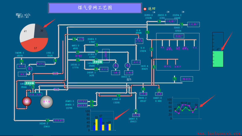 另外 HT 的矢量內置了 Chart 類型,矢量內置的 Chart 不同于傳統(tǒng)獨立的 Chart 組件,傳統(tǒng)的 Chart 是獨立的視圖 DOM 組件,但 HT 的拓撲是 Cavans 方式繪制,因此沒法實現 Chart 組件和普通圖元的不同層次融合顯示,但矢量的 Chart 類型倒是完美的實現了這樣的融合,很多工控應用的客戶會將矢量 Chart 與拓撲圖元素融合一體,可參見《基于HT for Web的Web SCADA工控移動應用》http://www.hightopo.com/blog/... 一文中 HT 的 Web SCADA 應用案例