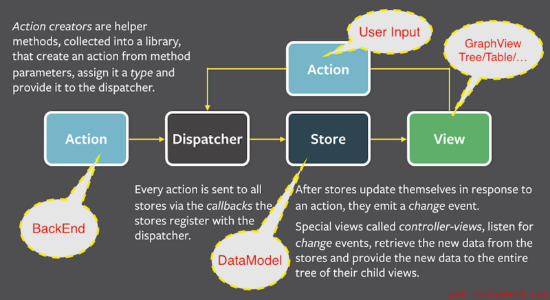 HT 的 DataModel 相當于 Flux 中的 Store 模塊,拓撲圖、樹和表格這些自然對應 View 模塊,一般發(fā)起 Action 動作就是后臺數據變化,或者用戶手工輸入表格屬性值之類,但最終都不是直接修改 View,都是從 Data/DataModel/Store 發(fā)起修改,然后數據模型派發(fā)事件給所有 View,最后 View 根據不同事件做相應的處理。