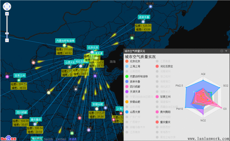 HT 的拓撲圖的節(jié)點位置都是邏輯坐標,并非 GIS 的地理信息經緯度坐標,但這并不妨礙 HT 的拓撲圖可以和百度地圖、GoogleMap、OpenLayers 等第三方 GIS 地圖引擎進行整合呈現,參見《百度地圖、ECharts整合HT for Web網絡拓撲圖應用》,該文將 HT 拓撲圖、百度地圖、ECharts、HT 連線流動和面板等插件做了個綜合的呈現展示效果:http://www.hightopo.com/demo/...