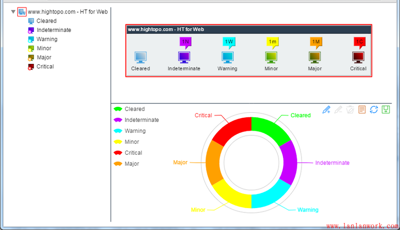 當然你也可以把 HT 與 百度 ECharts 進行整合,只要是 HTML 圖形組件就可以整合到 HT 的布局容器中,可參考《ECharts整合HT for Web的網絡拓撲圖應用》,此例子將 ECharts 整合 HT 拓撲圖做了告警統(tǒng)計的圖表呈現效果: