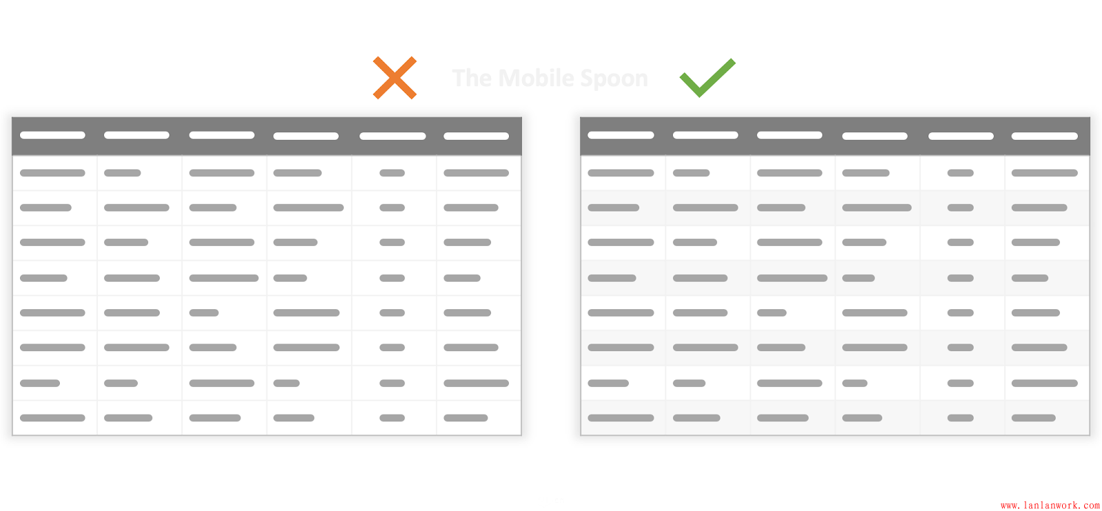 斑馬紋的表格可以幫助用戶保持其位置,但是彩色的行必須非常淺,否則會引起誤導,看起來像選定的行。