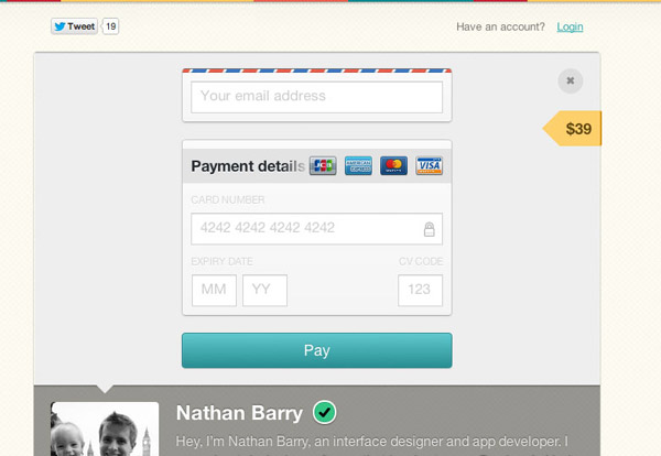 Gumroad在未登錄狀態(tài)的支付表單中剔除了很多常見的“必填”字段,最終只保留了用于輸入郵箱地址、信用卡號、有效期和CV碼的文本框。如果連未登錄時的支付環(huán)節(jié)都可以被如此簡化,我相信對于其他方面業(yè)務(wù)的那些復(fù)雜表單來說,不會沒有優(yōu)化空間的。