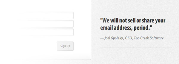 在為訪問者提供積極引導(dǎo)的同時,我們還要想辦法避免掉那些負(fù)面因素。人們在填寫表單時的最大顧慮就是信息被網(wǎng)站方收集之后的用途。用戶不會希望收到垃圾郵件,更不愿意自己的個人信息被傳播出去。如果你確實運(yùn)營著一個值得信賴的產(chǎn)品,那么不妨直接讓用戶知道你不會把他們的信息販賣出去或是向他們發(fā)送垃圾郵件,就像FogBugz做的那樣,在注冊表單旁邊以非常直白的口語化的方式告訴用戶“我們不會出售或分享你的郵箱地址,就是這樣。”
