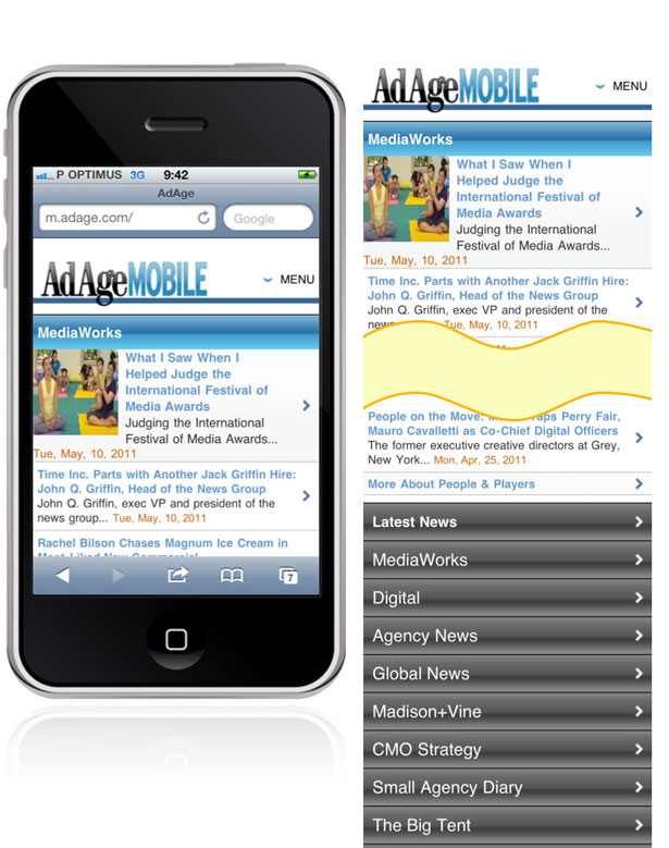 確實是這么回事。移動版本的站點,在布局方面,應該使主要內容盡量多的占據著首屏當中的空間,而導航結構則應該以某種縮略的形式出現在相對次要的位置。Wroblewski通過一個實例來倡導這個設計模式,也就是Ad Age的移動版站點 。其首屏當中,除了網站標題及內容列表之外,右上角的菜單按鈕是界面當中唯一一個交互控制元素。當用戶點擊這個按鈕時,導航列表才會出現在屏幕當中。看上去,整個導航列表好像是另外一個界面,但它實際上是被放置在頁面最下方的,而菜單按鈕只是個錨點而已。