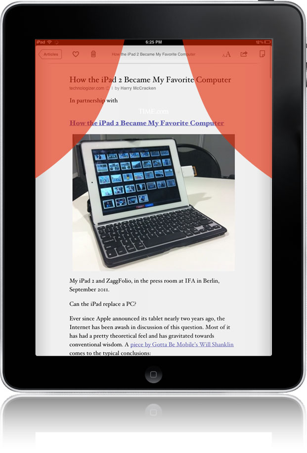 所以,與手機界面不同,在iPad及同類平板設備的應用當中,主要的交互控制對象應該被放置在界面的左上角或右上角,以便拇指可以很容易的觸摸到。Instapaper和Twitter在這方面做的都不錯: