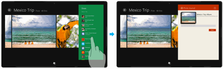 我們還可以進(jìn)一步利用Metro應(yīng)用獨(dú)特的功能特性,讓不同的應(yīng)用訪問和使用彼此所包含的文件,例如在其他應(yīng)用中使用相片日志應(yīng)用里的圖片。通過這樣的功能,用戶無需首先在相片應(yīng)用中將圖片下載到本地,然后再上傳到另外的應(yīng)用中;系統(tǒng)會(huì)將所有支持文件選擇器契約的應(yīng)用都看作是一個(gè)可以在任何地方讀取的文件存儲(chǔ)位置。