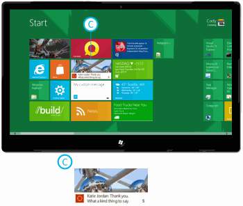 而Windows 8中的瓦片則整合了通知中心與數(shù)字標(biāo)識(shí)這兩個(gè)方面的提示功能,用戶即可以直接在瓦片中閱讀提示信息,也可以點(diǎn)擊進(jìn)入應(yīng)用。另外,與iOS通知中心統(tǒng)一化的輸出格式有所不同,Metro風(fēng)格的應(yīng)用瓦片允許設(shè)計(jì)師從大量模板當(dāng)中選擇不同的樣式。