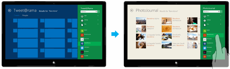 如上圖所示,用戶當(dāng)前處于Tweet@Rama 應(yīng)用的環(huán)境當(dāng)中,出于某種需求,該用戶希望搜索相片應(yīng)用當(dāng)中所有包含“Barcelona”關(guān)鍵詞的相片。輸入了關(guān)鍵詞之后,用戶在搜索托盤中選擇相片應(yīng)用,使其成為搜索結(jié)果提供者,這時(shí)相片應(yīng)用就會(huì)自動(dòng)加載,并顯示相關(guān)的搜索結(jié)果。這種方式使得用戶無需手動(dòng)在當(dāng)前運(yùn)行的應(yīng)用與搜索目標(biāo)應(yīng)用之間進(jìn)行切換。