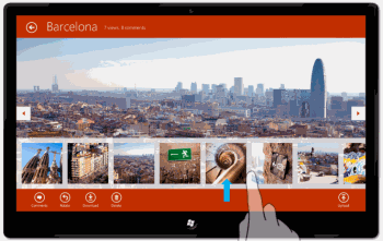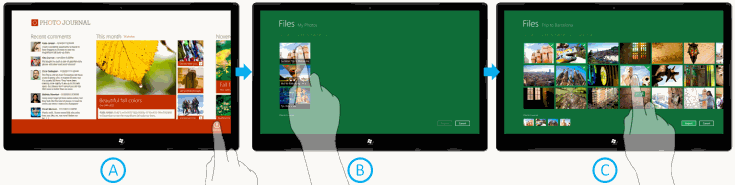 無論在iOS還是Windows中,這兩個(gè)手勢(shì)在很多時(shí)候都被用作放大或縮小內(nèi)容對(duì)象的尺寸。不過對(duì)于Metro應(yīng)用來說,它們還可以通過Semantic Zoom來實(shí)現(xiàn)內(nèi)容層級(jí)間的導(dǎo)航。用戶可以捏合某個(gè)內(nèi)容對(duì)象,來進(jìn)入它所在的相關(guān)內(nèi)容組。不過,當(dāng)用戶正在以全屏模式瀏覽單張相片的時(shí)候,捏合與張開的手勢(shì)還是會(huì)被用來調(diào)整圖片的尺寸。
