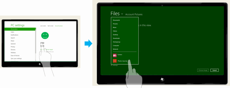 如上圖所示,用戶在PC Settings界面中點(diǎn)擊“瀏覽”,以更換頭像圖片。由于我們的相片日志應(yīng)用支持文件選擇器契約,所以在接下來的文件選擇界面中,就會(huì)看到應(yīng)用名稱出現(xiàn)在列表當(dāng)中,用戶可以選擇該應(yīng)用當(dāng)中存儲(chǔ)的相片作為新的頭像。