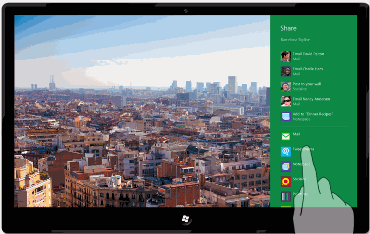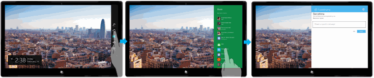 而在Metro風(fēng)格的應(yīng)用當(dāng)中,我們會(huì)使用分享契約 。這種技術(shù)方案簡(jiǎn)化了設(shè)計(jì)與開發(fā)方面的工作,因?yàn)槲覀儾恍枰獮橛脩粲锌赡苡玫降纳鐣?huì)化服務(wù)而將它們與每個(gè)單獨(dú)的應(yīng)用都逐一整合起來。不僅是社會(huì)化服務(wù),用戶還可以將信息保存共享至平臺(tái)上所有那些使用了分享契約的應(yīng)用,而開發(fā)者們則無需擔(dān)心外部服務(wù)的接口問題。站在用戶的角度,他們可以在charms bar這個(gè)固定的地方完成有關(guān)分享的操作。