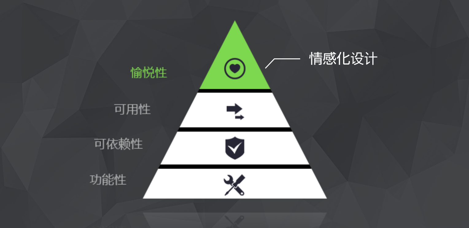 《情感化設(shè)計心理學(xué)中》作者唐納德·諾曼將情感化設(shè)計與馬斯洛的人類需求層次理論聯(lián)系了起來。 產(chǎn)品特質(zhì)也可以被劃分為功能性、可依賴性、可用性和愉悅性這四個從低到高的層面,而情感化設(shè)計則處于其中最上層的“愉悅性”層面當(dāng)中。