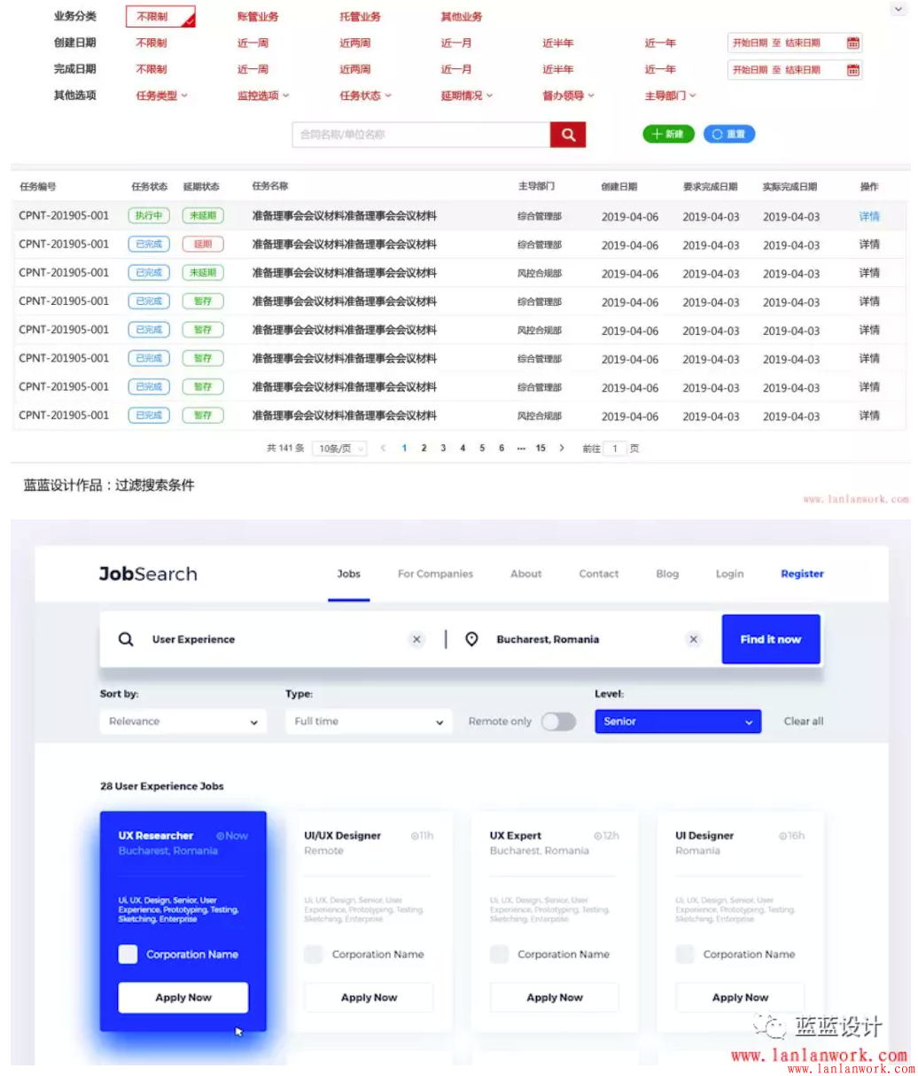 大多數(shù)表格的前面都有搜索過濾功能,如果搜索條件相當(dāng)多,可以精選一部分主要的排成一行,其他的隱藏,點箭頭再出現(xiàn)。整個搜索區(qū)域也可以有隱藏/顯示的按鈕,來給下面的表格更多的空間。