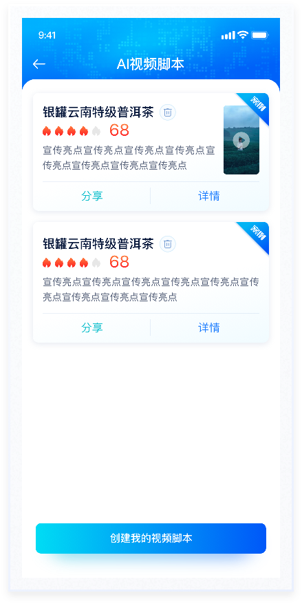 AI生成視頻腳本是用戶輸入相應條件后,AI大模型通過系統算法生成視頻內容。整體風格較為科技感,因此在配色上使用藍色漸變及較重投影,符合產品屬性,能夠突出產品的創新性和先進性。使用戶在使用過程中感受到強烈的視覺沖擊和沉浸感,這種體驗有助于增強用戶對產品的興趣。