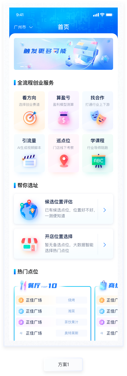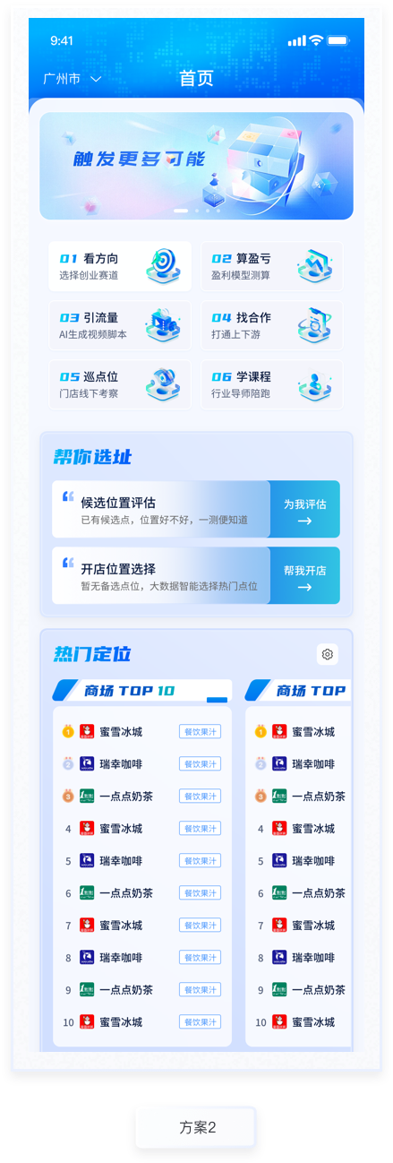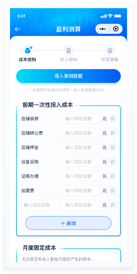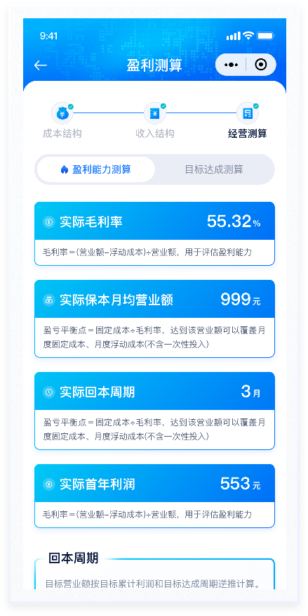 所盈利測算功能是產品的主要功能,通過AI對未來開店盈虧情況進行預測評估。本次設計主要優化該流程的交互及視覺表現,整個流程分為“成本結構”“收入結構”“經營測算”三個階段,過程填寫情況放置在頁面頂部,一步了然。已填寫使用主題色標注,未填寫則使用置灰顏色處理,符合用戶基本感知。按鈕使用與主色相近的漸變色。
