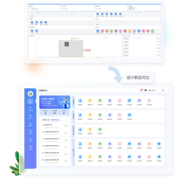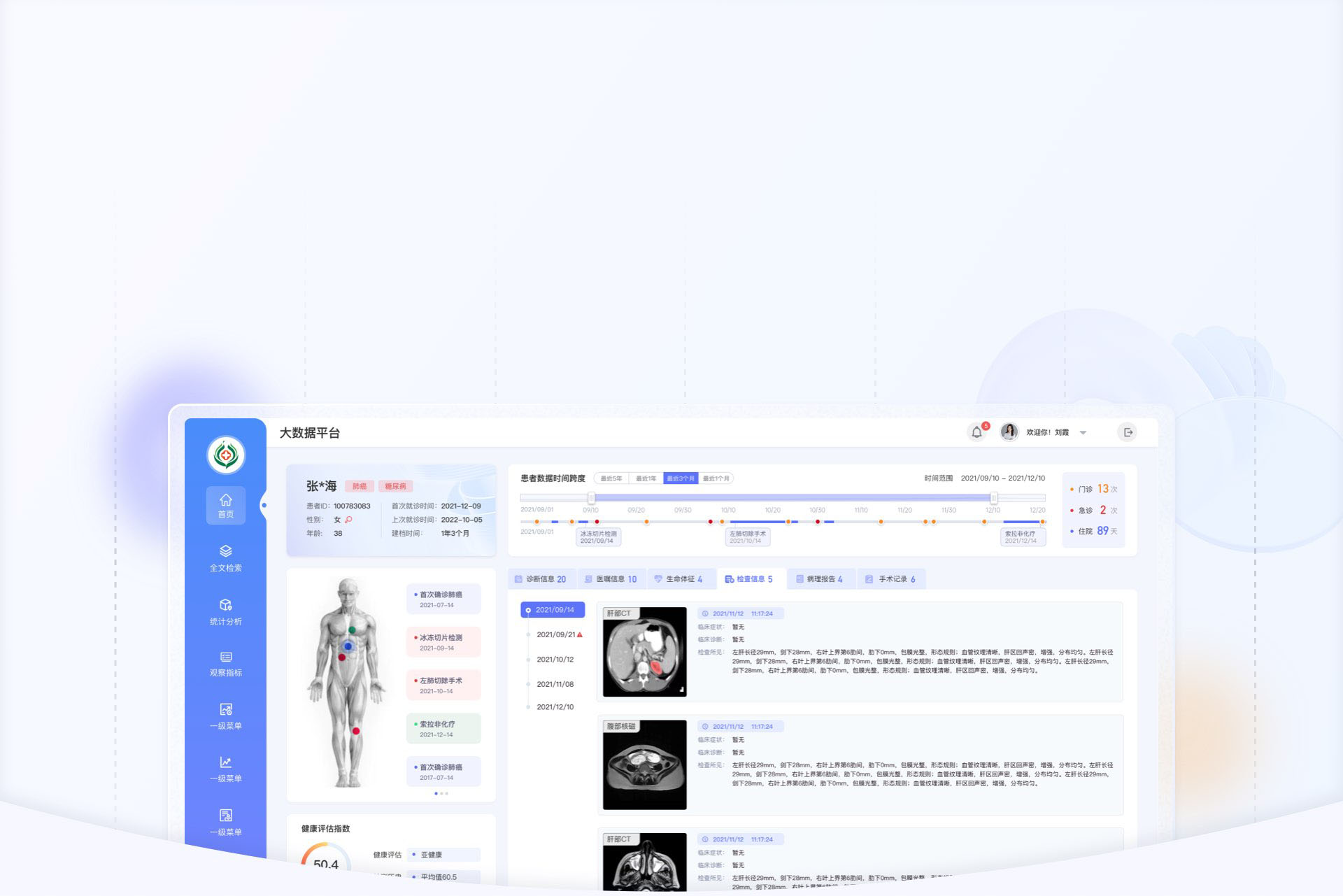 核心數據突出顯示-原來首頁沒有登錄人員信息,并且 [患者人數]、T病例份數]、手術臺數,等數據每個占據一個大框顯示頁面顯得空洞,通過整合增加登錄人員信息以及歡迎語,使整個頁面更有親和力,一些相關數據采用卡片疊加的形式展示,不能可以增加整個頁面的靈動感,并且把登錄人員的相關信息緊密關聯起來